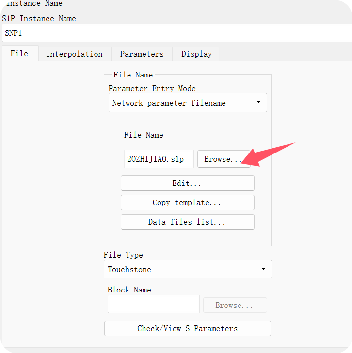 左边选择S1P控件和VSWR,以及s_param。s_param设置仿真的频率起止。S1P控件双击选择网分导出的文件。