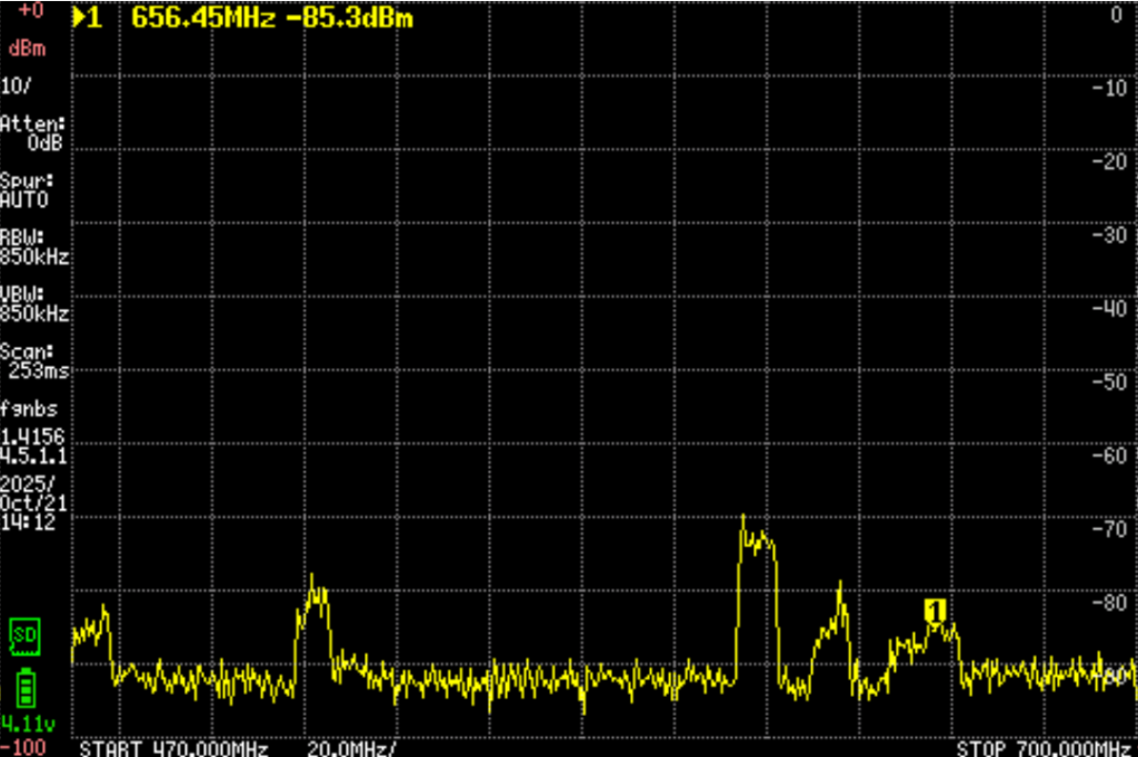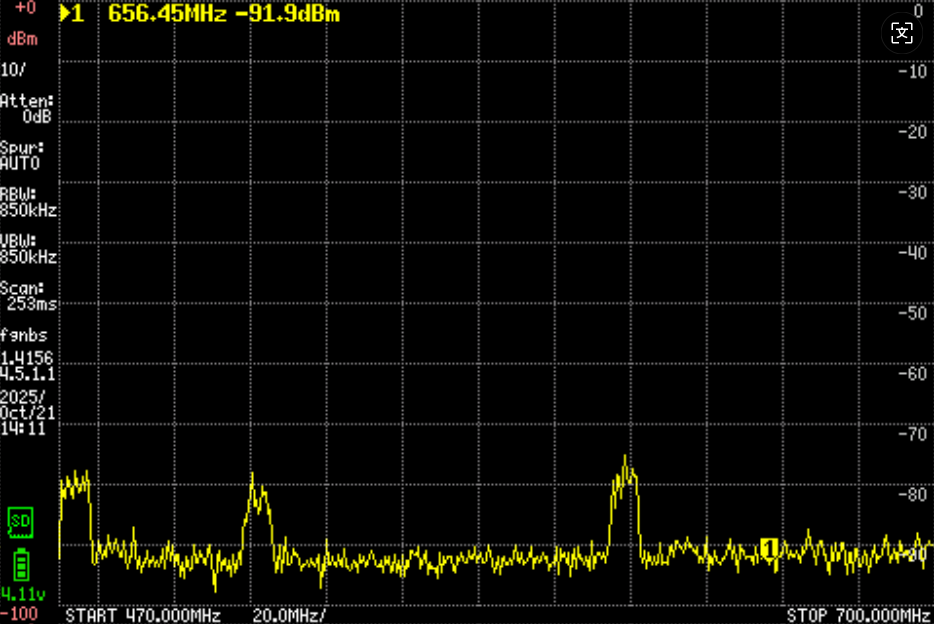 这幅图显示在610之上,有一个比较强,另外还有大概两三个波段。只是方向要非常准,而且很弱。图示看只有-85db。一定要非常多单元的振子外加放大器才行。但是确定有信号。