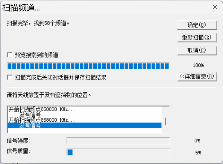 房间窗户处棒子天线测试-75到-80之间。只能收到3个频点,但是只能有两个频点解析出节目。