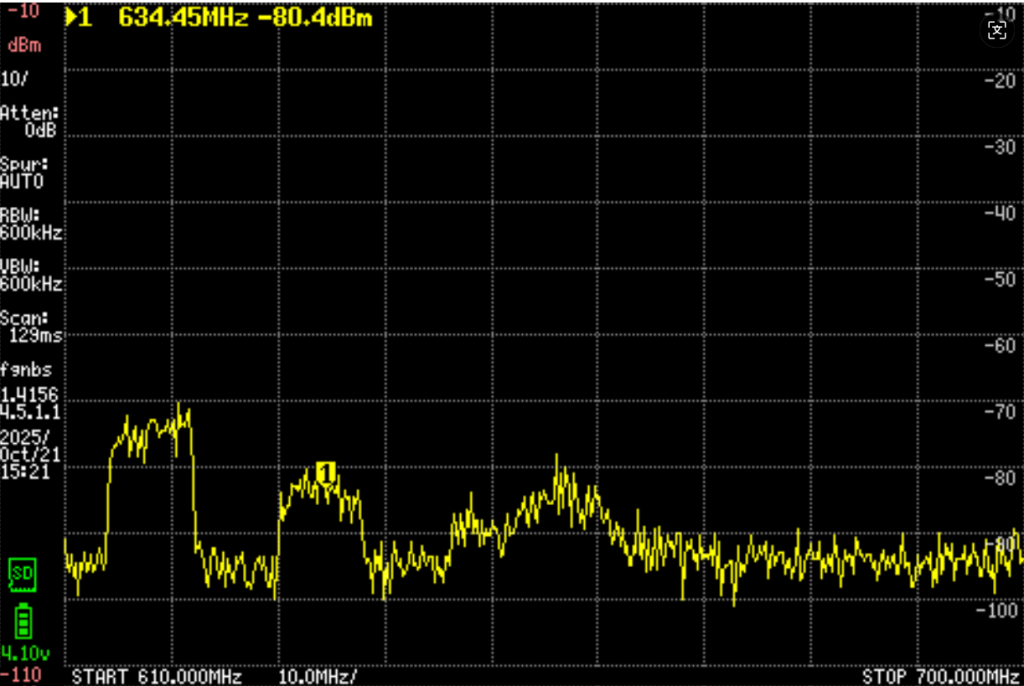 这幅图显示在610之上,有一个比较强,另外还有大概两三个波段。只是方向要非常准,而且很弱。图示看只有-85db。一定要非常多单元的振子外加放大器才行。但是确定有信号。